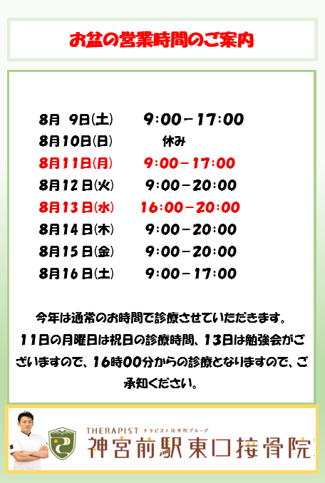 お盆期間中も万が一、お身体のことや痛みでお困りの際は上記時間内にご連絡ください。